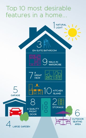 It came as no surprise to us that natural light is the most sought-after feature in a home, with 54 percent of homeowners agreeing that it is important to them. This was closely followed by storage (53 percent) and an en-suite bathroom (52 percent).
