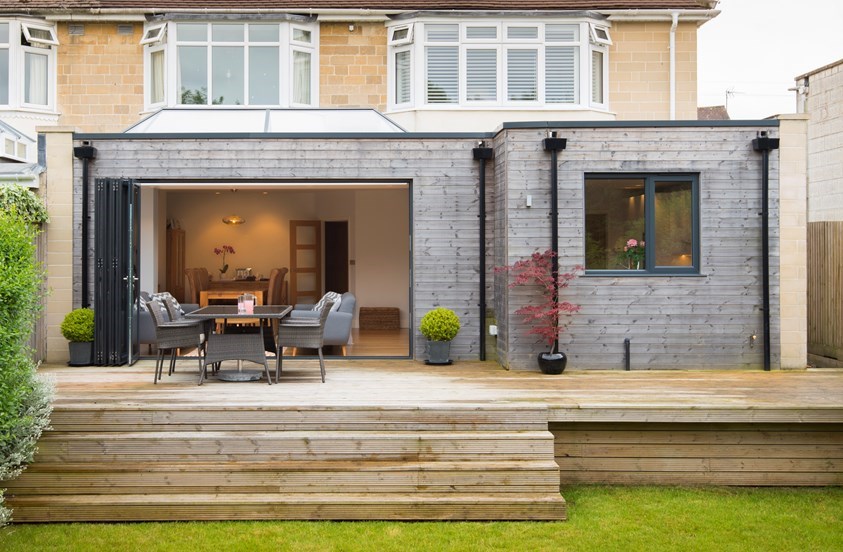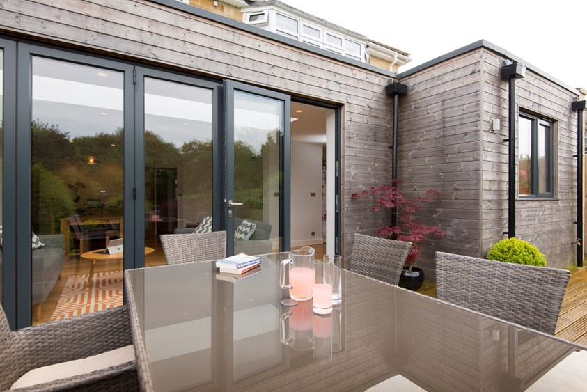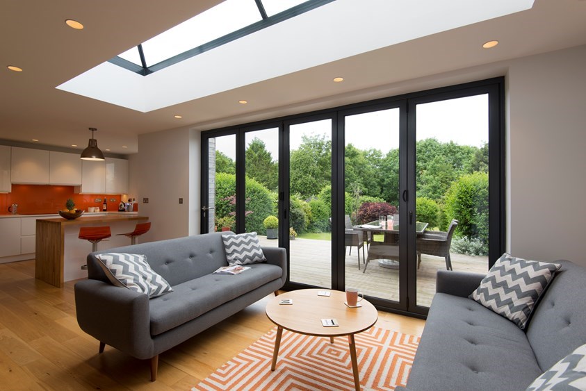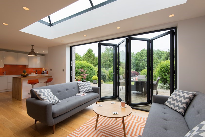 A roof light was fitted to provide more visibility for the area on dark evenings. Its RAL colour and profile were specially selected to match the bifold doors.