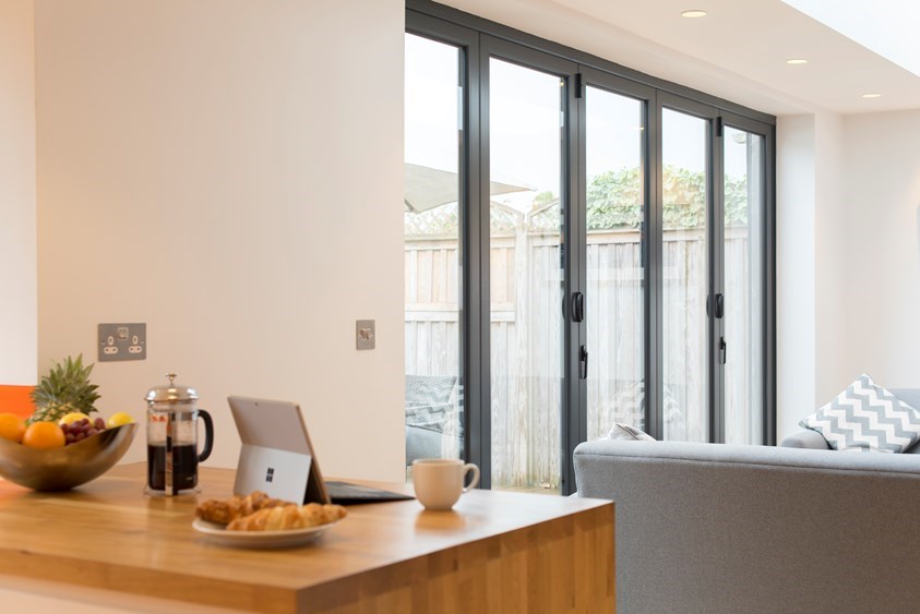 A 5+0 door configuration in anthracite grey (RAL 7016) was selected to run across a 4m opening. Five doors were considered the best option as the couple wanted all doors to open the same way, across the space. After consulting with their architect, further fine tuning was made to the design. As Drew explained: "We included a raised cill for practical reasons, and went with 2.35m high doors so we could let in as much light as possible. We matched our kitchen window height to the top of these doors, for aesthetics."