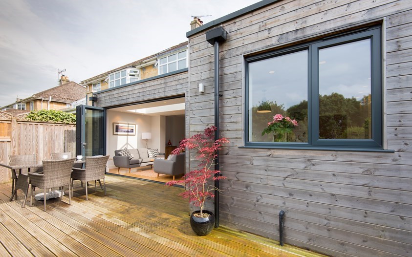 The window in question is also from Origin. It's a casement window, fixed and hung to the left, also in anthracite grey. Both doors and windows have brushed chrome handles, and their anthracite colour perfectly complements the larch-clad kitchen/diner which absorbs light and prevents glare from the Bath stone on sunny days. What's more, it's a natural material that works in harmony with the surrounding environment.