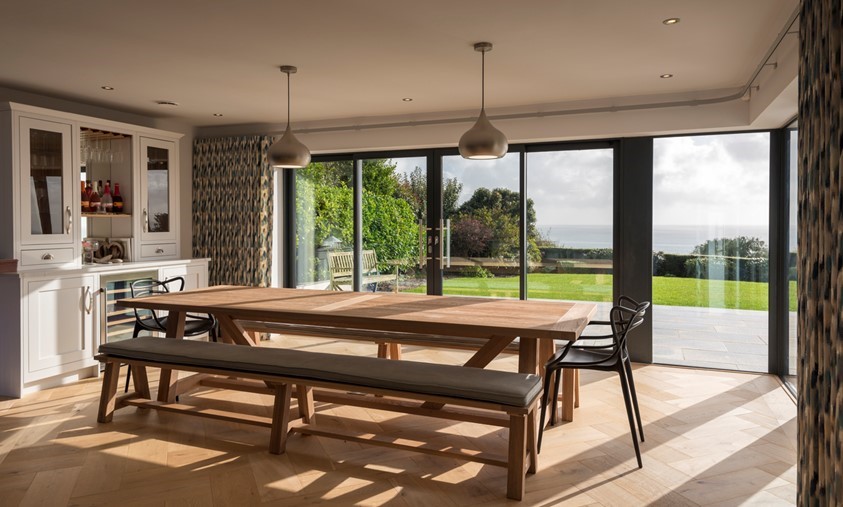 The OS-44 Sliding Doors take centre stage, offering slim sightlines that maximise the panoramic coastal views. Large expanses of glazing flood the interior with natural light, creating a sense of openness and tranquillity. The minimalistic frames ensure that the focus remains on the breathtaking scenery while maintaining a modern and clean architectural aesthetic.