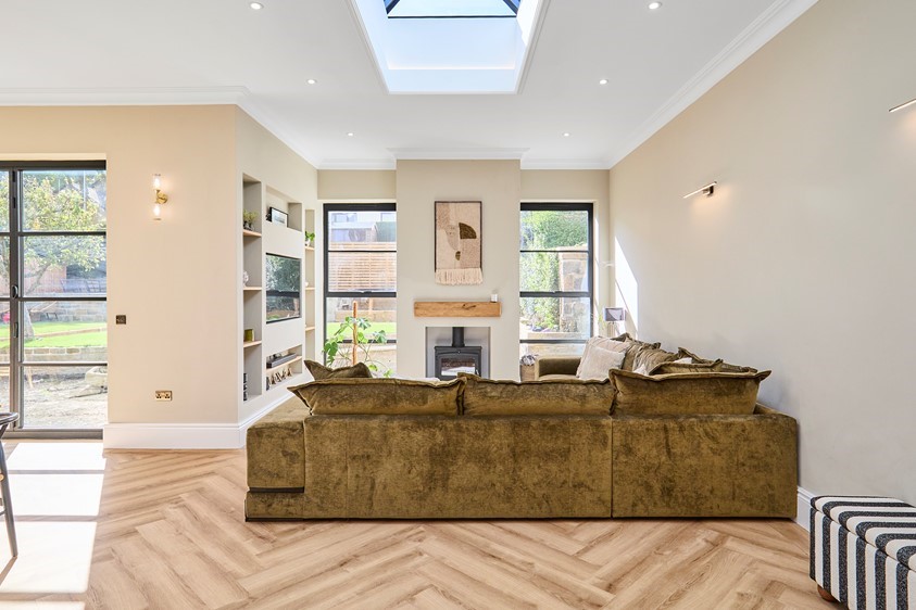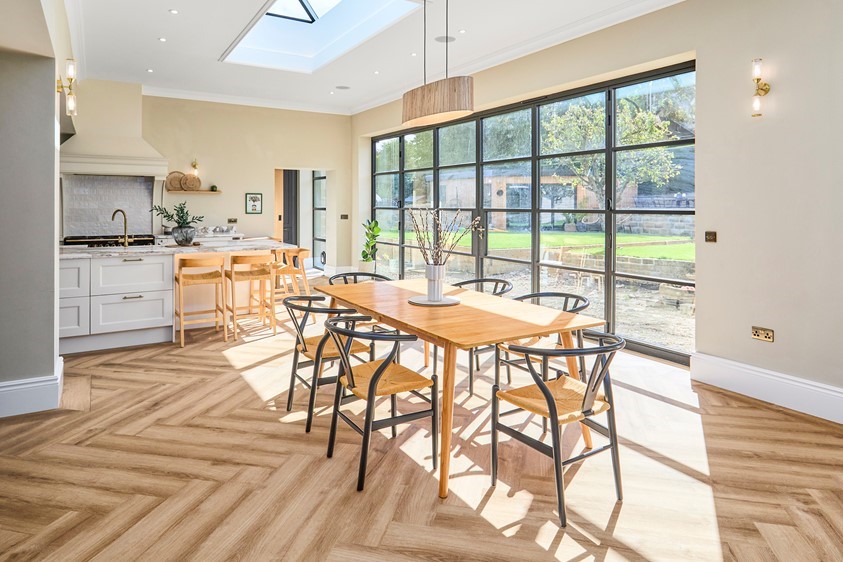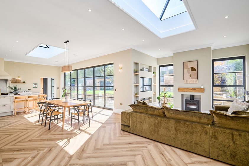 The installation of OW-70 Slimline Windows ensures uninterrupted views and a continual connection with the garden. Their ultra-slim frames maximise natural light and work harmoniously with the OB-36+ doors to create a feeling of openness. The result is a space that feels effortlessly connected, every room benefits from abundant light and enhanced symmetry.