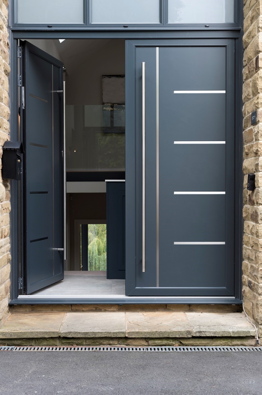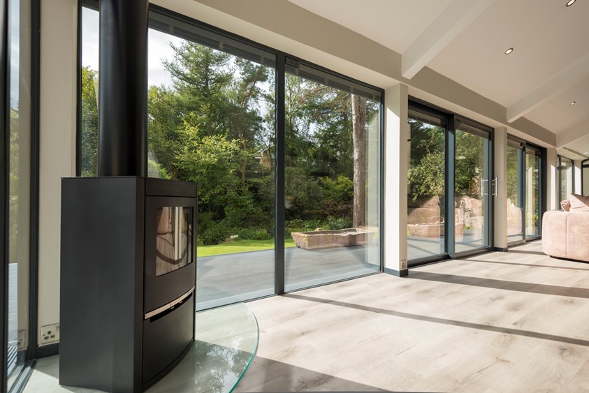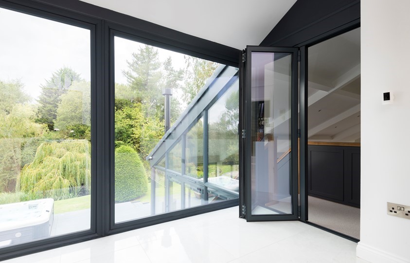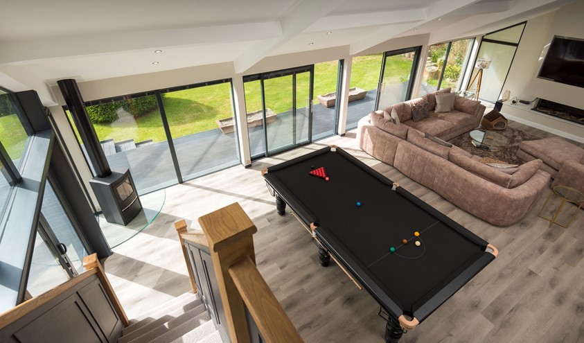Opting for a wide variety of products, Origin not only delivers on quality but also range of offering. It was important to the couple that their home felt cohesive, from the moment you step in the front door, to standing in the back garden. The homeowners took advantage of Origins wide range of products, choosing a consistent colour scheme of RAL 7016M anthracite grey, the home features a grand double front door entrance way, using our Kensington residential door panel SE07, that really sets the tone for what’s to come. As you make your way through the house, natural light floods through the huge fixed windows that perfectly frame the stunning views encapsulating the home. Combined with large OS-44 Sliding doors, the concept of indoor/outdoor living couldn’t be truer in this property. As well as external products Craig used our OB-49 Bifold to create an internal divide between rooms, using a non-weathered threshold sunken into the floor, Craig created a seamless look allowing the flexibility of joining or separating the kitchen from the rest of the house.