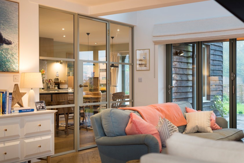 They selected Pebble Grey RAL 7032 matt for the internal doors and RAL 7030 matt for the exterior bi-folds, which harmonise beautifully with the home’s wooden cladding and soft natural palette. The green-grey tones of the bi-fold doors add a touch of elegance, while the thinner mullions and stiles give the doors a refined aesthetic and allow for unobstructed views of the surrounding landscape.
