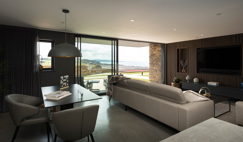 Always favouring sliding doors over bi-folds, the developer loves how the Origin OS-29 offers minimal interruption for the striking view, and the customisable ironmongery + a choice of over 150 RAL colours, they were able to create a contemporary look that is set off well to the Stainless-Steel handles.