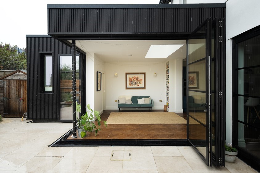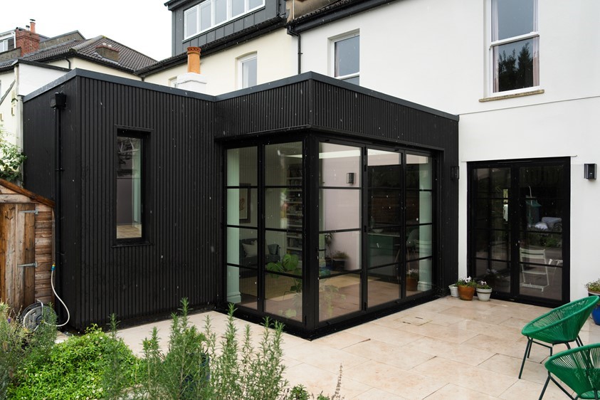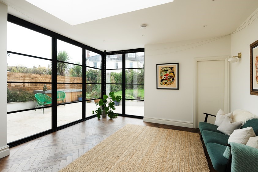 From the exterior, the black-clad structure contrasts beautifully with the original white façade, framing the glazed corner as a bold and contemporary addition to the home’s character.