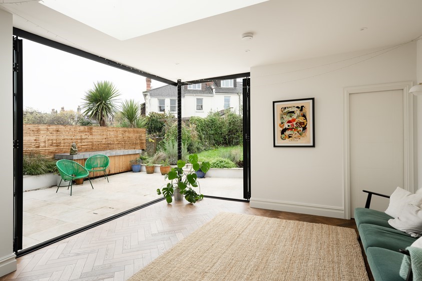 When opened, the doors completely remove the barrier between home and garden, creating a flexible space perfect for entertaining or relaxing. Even when closed, the expansive glazing provides uninterrupted views and a constant connection to nature.