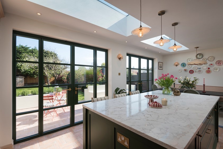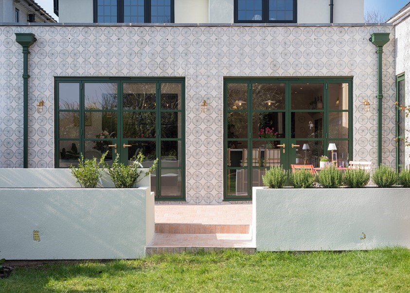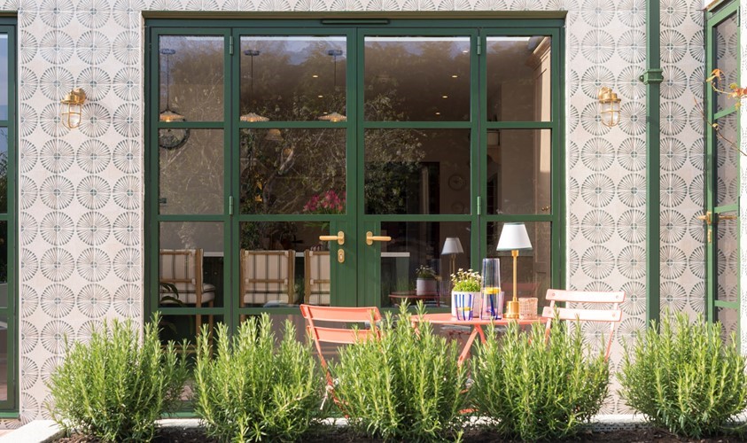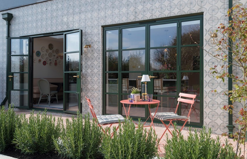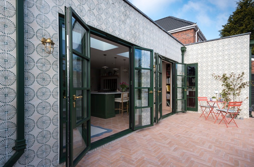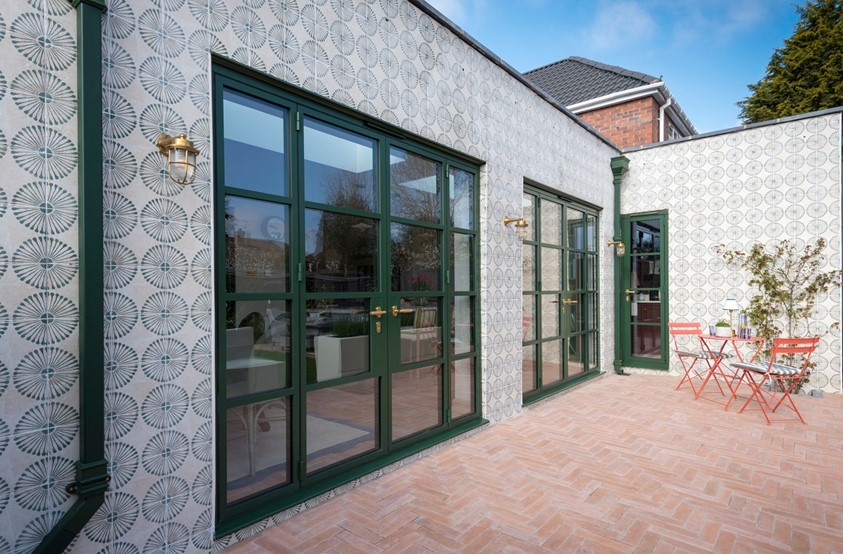 His selections included a striking OI-30 French door in RAL 6020M Chrome Green to divide the sitting room from the kitchen, and a bold pantry door in RAL 3011M Brown Red, both echoing tones used throughout the kitchen. To create cohesion between indoors and out, Mo opted for two coordinating sets of OB-36+ Soho French doors leading to his Mediterranean-inspired patio. Matched in configuration and colour, the symmetry between the internal and external doors is a smart design choice, using bold colour and thoughtful transitions to bring a sense of harmony throughout the space.
