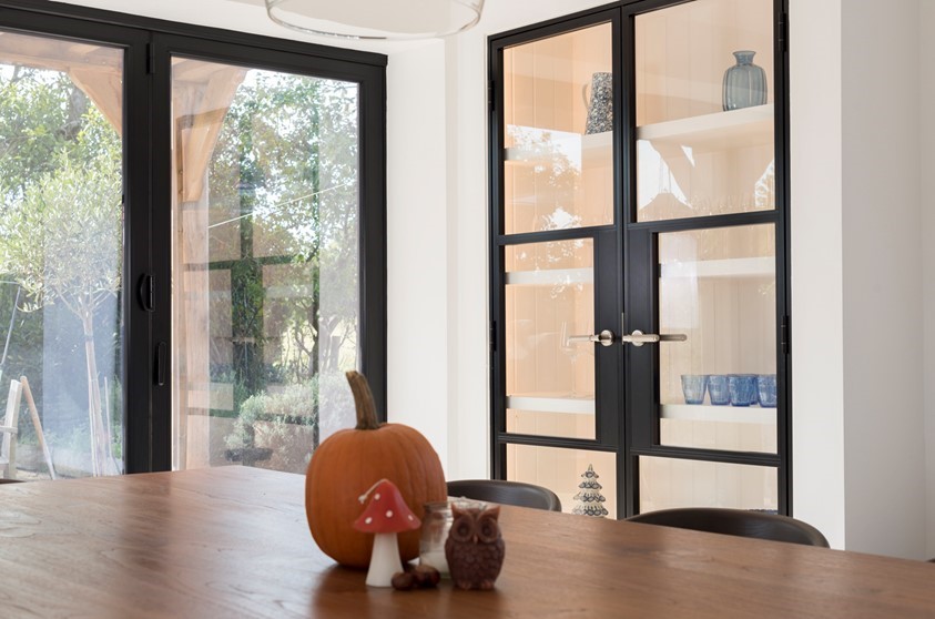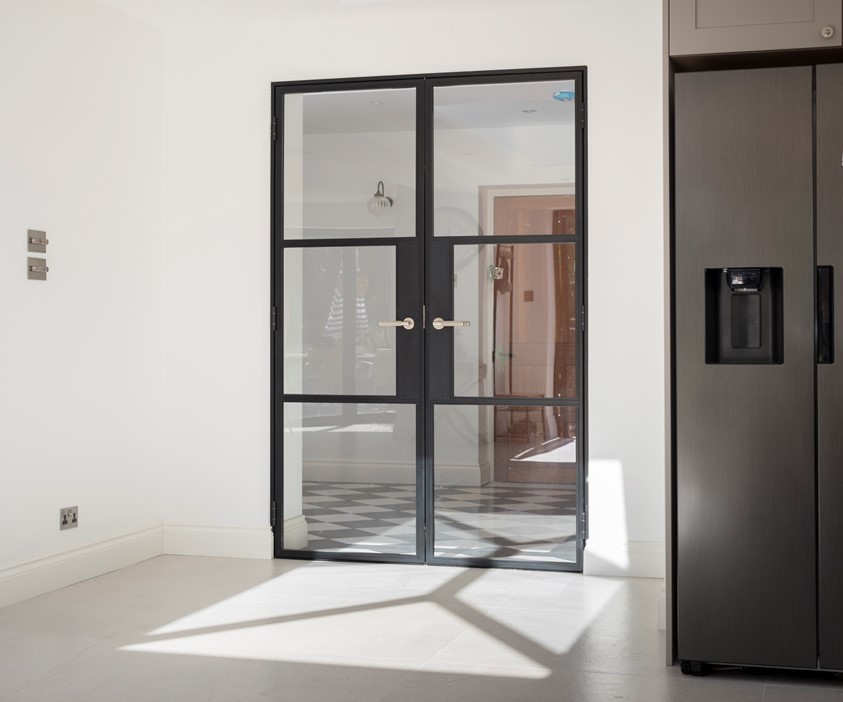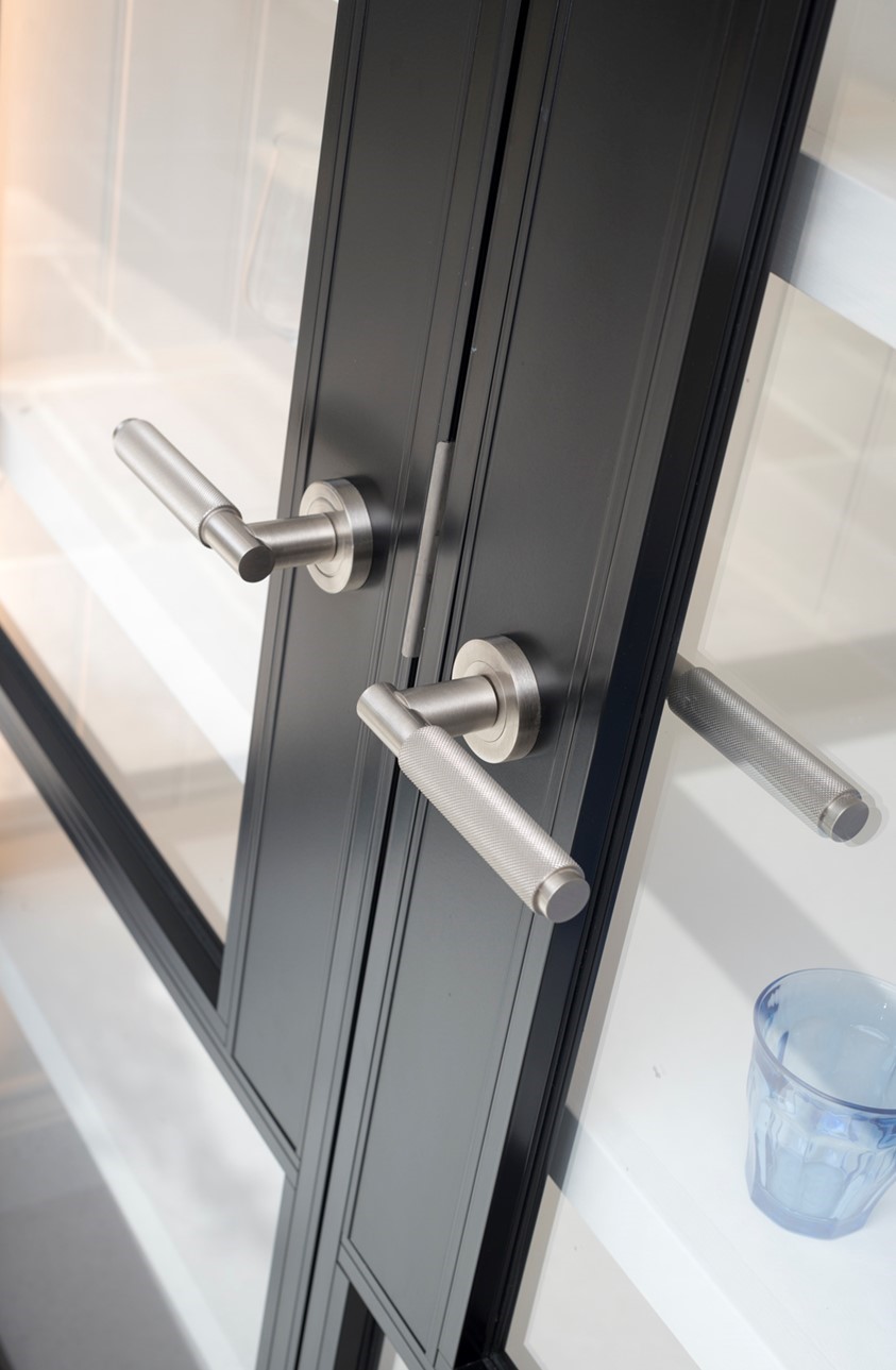 When we visited, the house had 3 sets of Internal Doors with one as the entrance doors to the kitchen and the other sets as beautiful cupboard doors showing the versatility of the Internal Doors. Adjacent to the cupboard doors is a 4-pane bi-fold leading to the garden which allows natural light to flood in in the masses, makes the room feel even larger. The ironmongery on the Internal Doors are consistent throughout, with the Silver coloured handles really standing out against the black Internal Doors. The handles are able to be colour-matched to the profile if you are wanting a more uniformed look, or you can opt for the handles to be different colour creating an accentuated look. The Internal Door handle options can be found here.