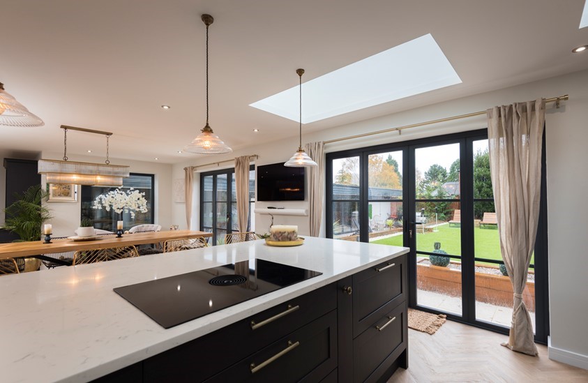 Offering the most glass and thinnest sightlines, Jenni decided on the OB-49 Origin Bi-fold and the OW-70 Origin Slimline Window; all with Astragal Bars added on to the glass. This creates a look reminiscent of the Georgian era with a modern feel with the aluminium material and slim profiles.