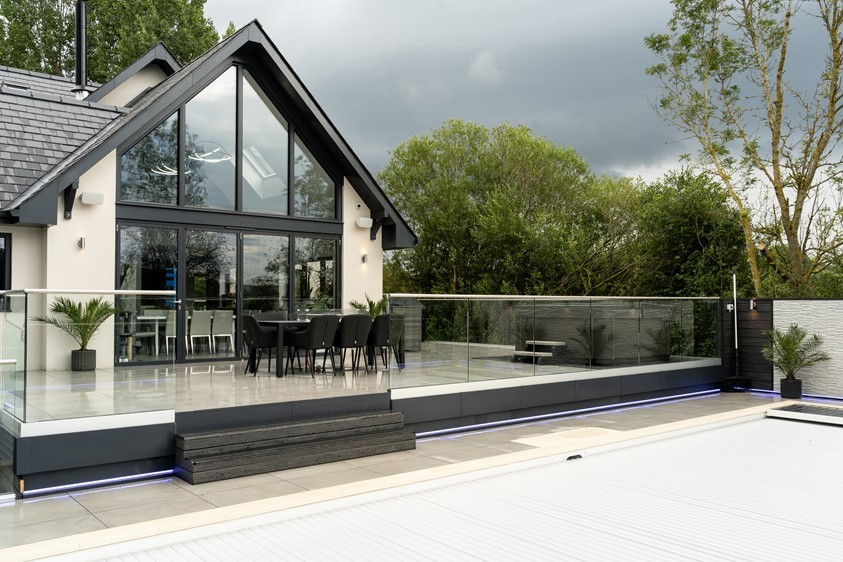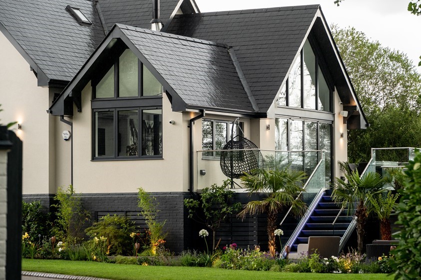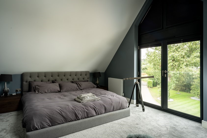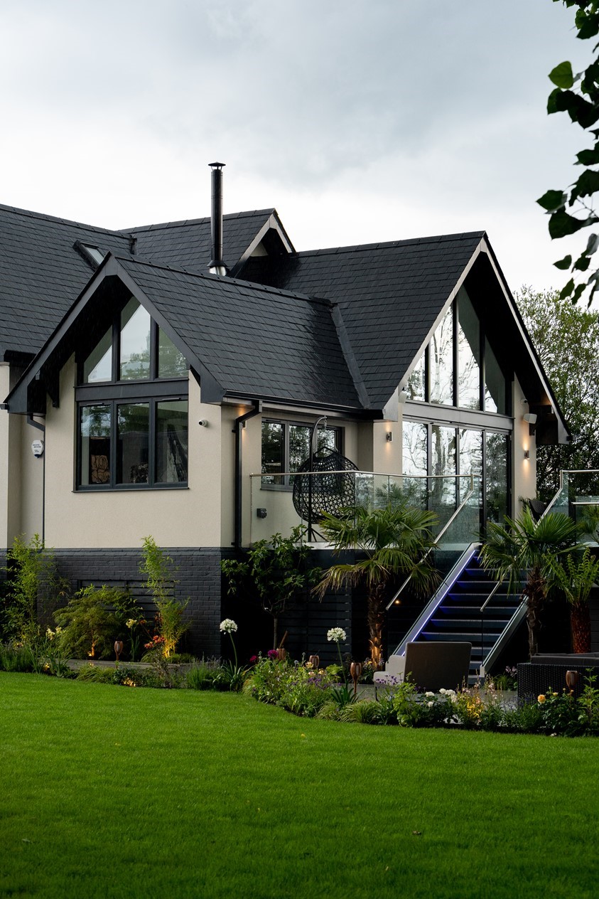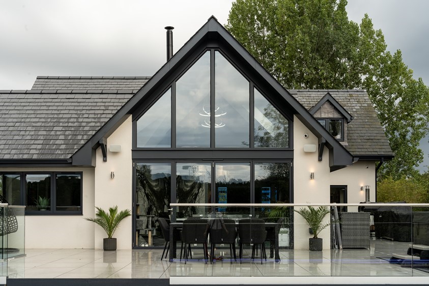 With dreams of creating the perfect showcase, modern home, this family focussed on creating clean lines and contrasting features that were highlighted through clever use of both natural and artificial lighting. Glazing was a huge vocal point of this property, using the doors and windows, not only as a commodity product, but a design feature that transformed this property from your basic detached home, to a stand out show piece. Across their doors and windows the couple opted for RAL colour 7016M, Anthracite Grey, this deep cool toned grey allowed for the perfect contrast against the properties bright white render and it’s green surroundings. Creating eye-catching moments throughout the homes architecture is what makes this property so special; Using impressive floor to ceiling gable windows as well as two story stacked Bi-fold sets, the homeowners have used symmetry and considered placement of their glazing to give their home the real wow factor.