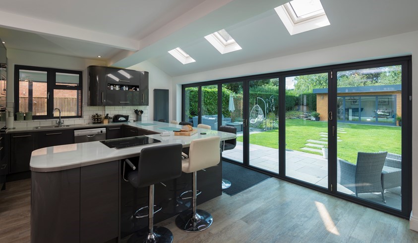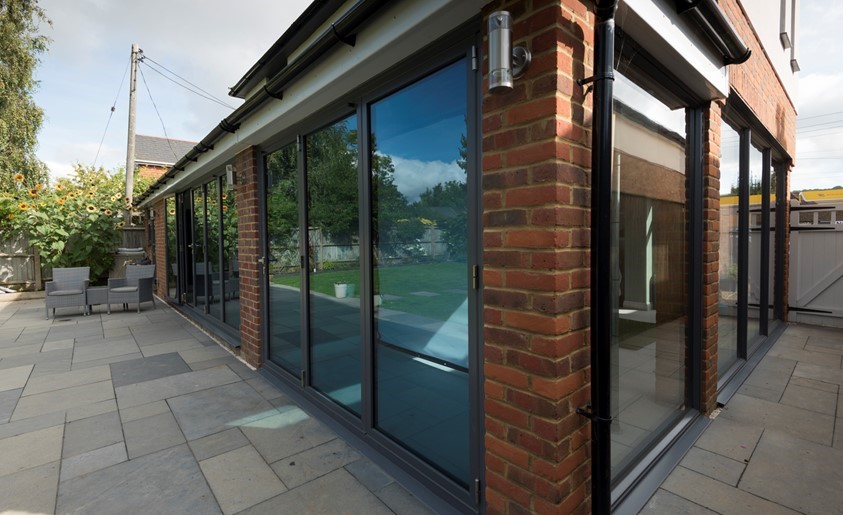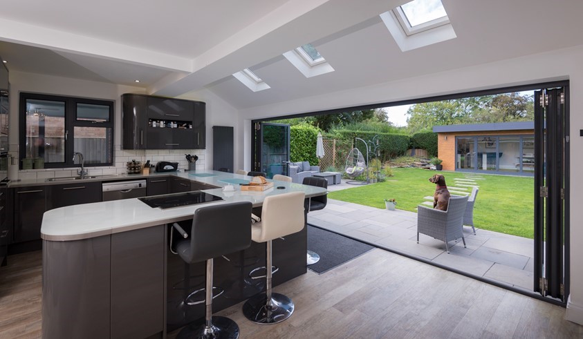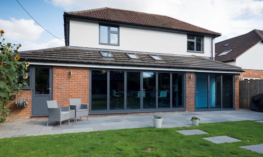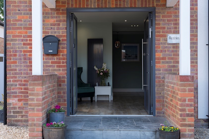 The homeowners dream was to transform this property into the perfect modern family home, with every door, and window designed specifically to maximise the space and enhance the natural light. Now every room in the house feels bright and airy, with a clean and contemporary feel. Creating the ideal combination of open and broken plan living, this property is now the epitome of the ideal, modern family home. With sleek, slate grey (RAL 7015) doors and windows, contrasting against the white render and timber cladding, they make the perfect statement, whilst complimenting it’s surroundings. This house really has thought of every detail, with solar glass used on the bifolds to help cool the house in the summer, to an interchangeable golf room, that can be transformed with our bifolds to become the perfect party room. This home has been designed to have multiple uses, prioritizing the practicalities of ever changing family life and using Origin products to help achieve this.