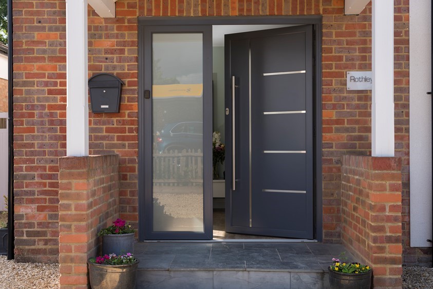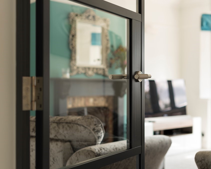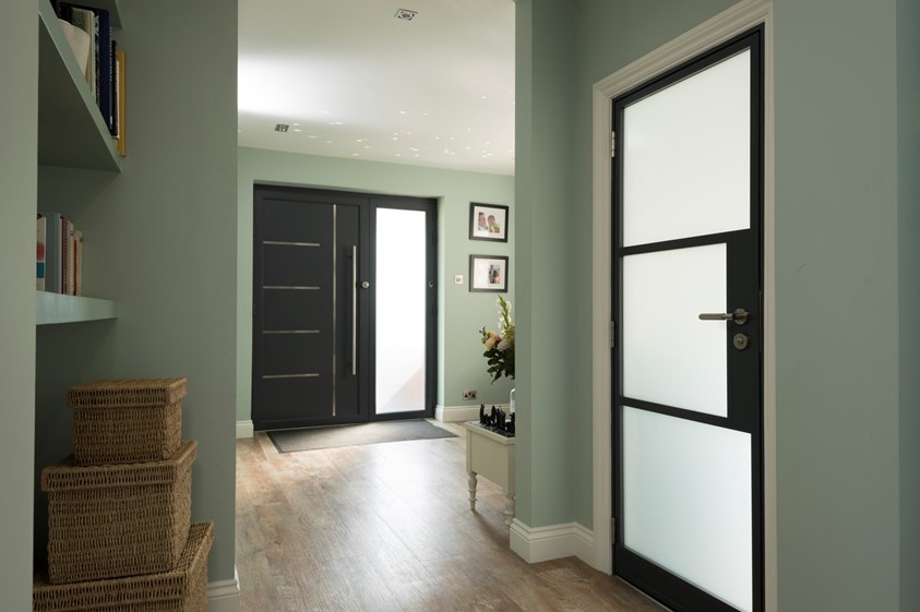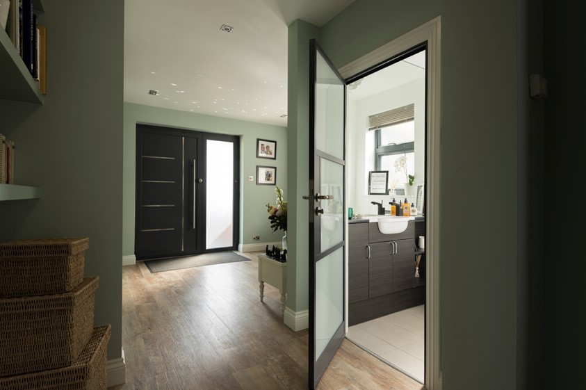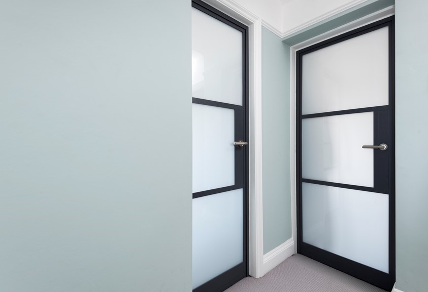 After seeing Origins new internal door launch in 2022, the family knew this product would be the perfect finishing detail to their home. Already over the moon with their existing products, there was no hesitation as the whether these doors were the right fit for this families home. With Origins colour offering, of over 150 RAL colours, it meant the family were able to colour match their new internal doors to their existing products in slate grey (RAL 7015m) to keep a continuous aesthetic from inside to out. With the homeowners wanting to replace every internal door in the house, they opted for white laminate glass on rooms such as bathrooms and bedrooms to maintain privacy. - This glass has a similar look and behavior to satin or frosted glass, still allowing light to flood through, but the opaque internal finish of the glass, means that no shapes or movement can be seen from the other side, allowing maximum privacy. As well as the bespoke glass choices, the family opted for our signature knurled handle in satin nickel, this kept the ongoing theme of silver hardware and complimented the interior style seen throughout their home.