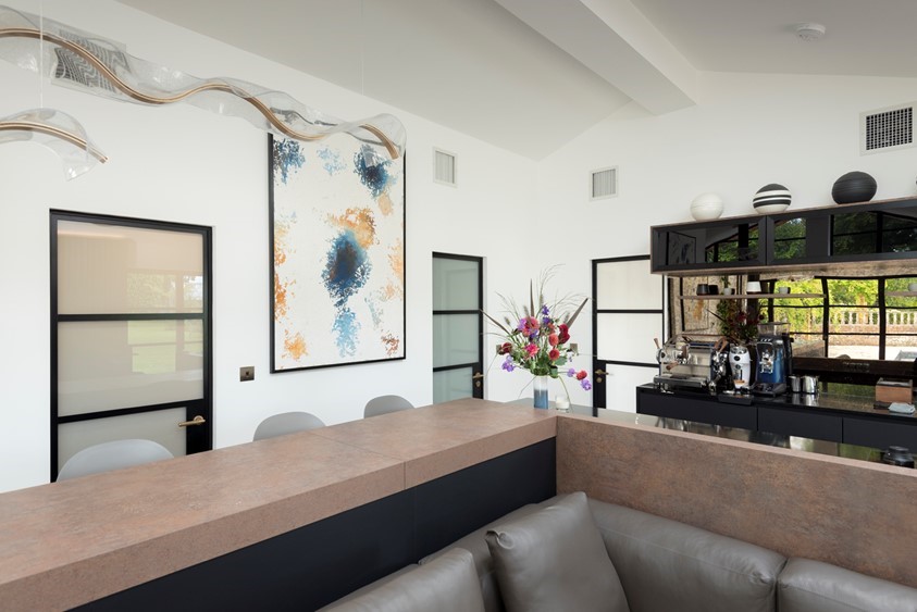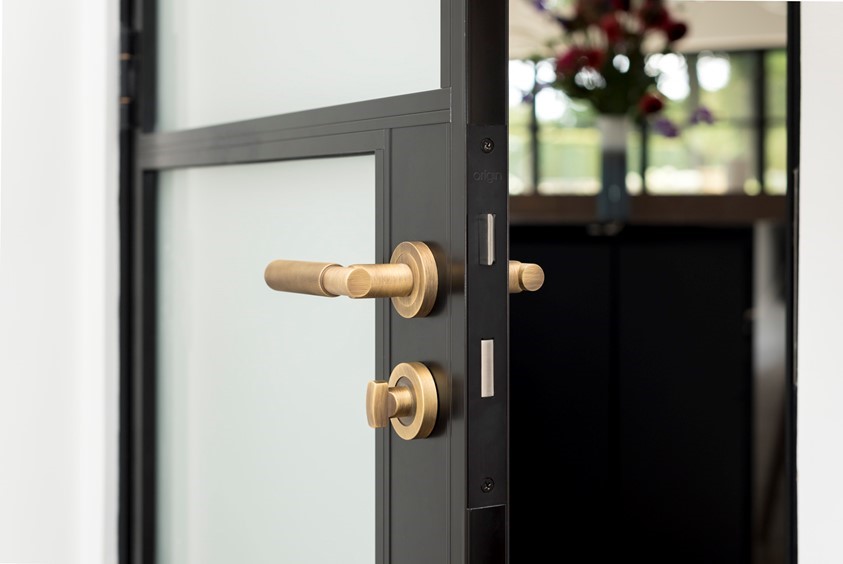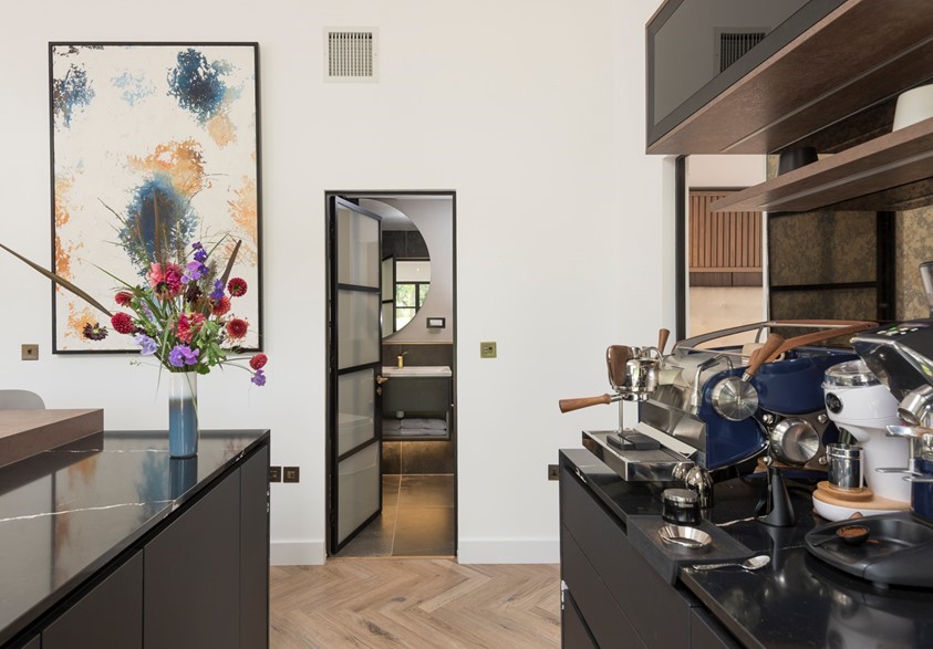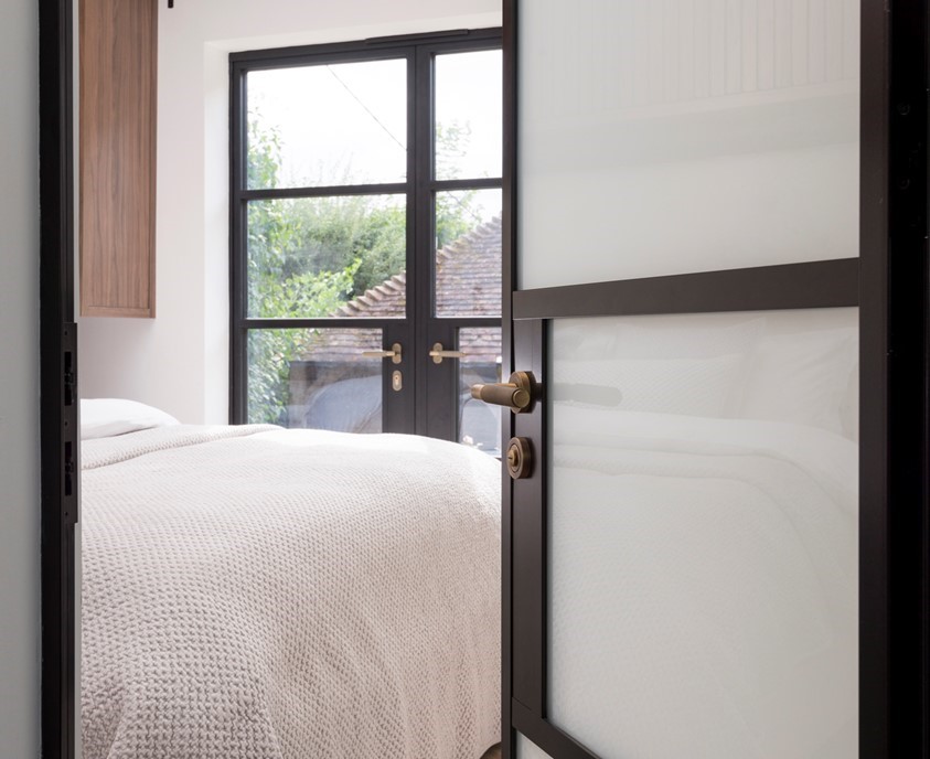 Opting for a large set of Origin’s soho bi-folds with a floating corner post in a textured matt black finish, these doors aren’t just stunning when closed but also allows the family to completely open up their space, creating an immediate transition from indoor to outdoor living. Whilst the doors make a statement themselves the homeowners were keen to make the most of the natural light surrounding this property and opted for a gable window to sit above this already impressive set of doors. Featuring Origins OW80 gable window with stuck on atragal bars, this product mimics the look of the doors below whilst allowing light to flood through the annex from all angles. As well as serving the purpose of a pool-house, the family wanted to create a sanctuary in which their friends and family could stay when they visited; with a stunning kitchenette and lounge area, one bathroom and two bedrooms, the property needed more than just external doors and windows to finish off this dreamy space. Opting for Origins OI30 Soho internal doors seemed like an obvious choice, being the sister product of the Soho external doors, paired together, Origin’s Soho products are a match made in heaven. With matching antique brass hardware and true slim divides, the property is the definition of a soho house dream. With every detail thought through, from entrance doors in the form of Soho French, bi-folding and single doors scattered around the building, no detail was missed when it came to creating this picture perfect soho home.