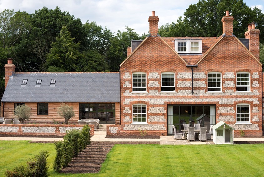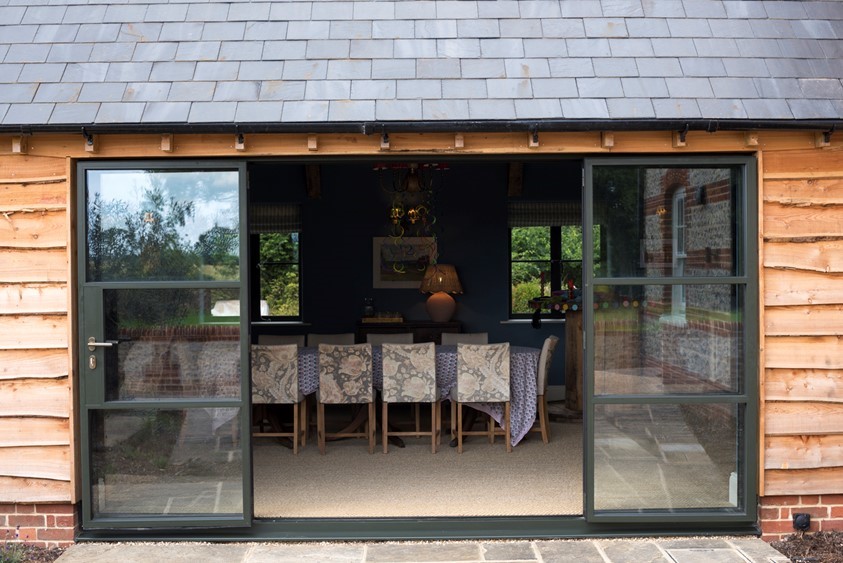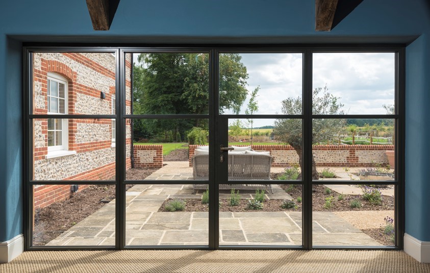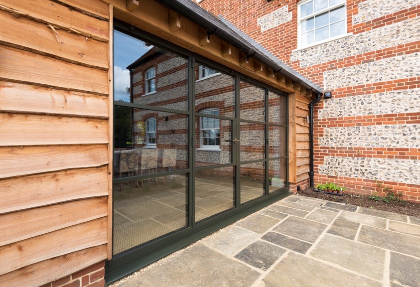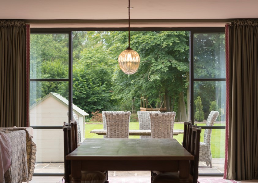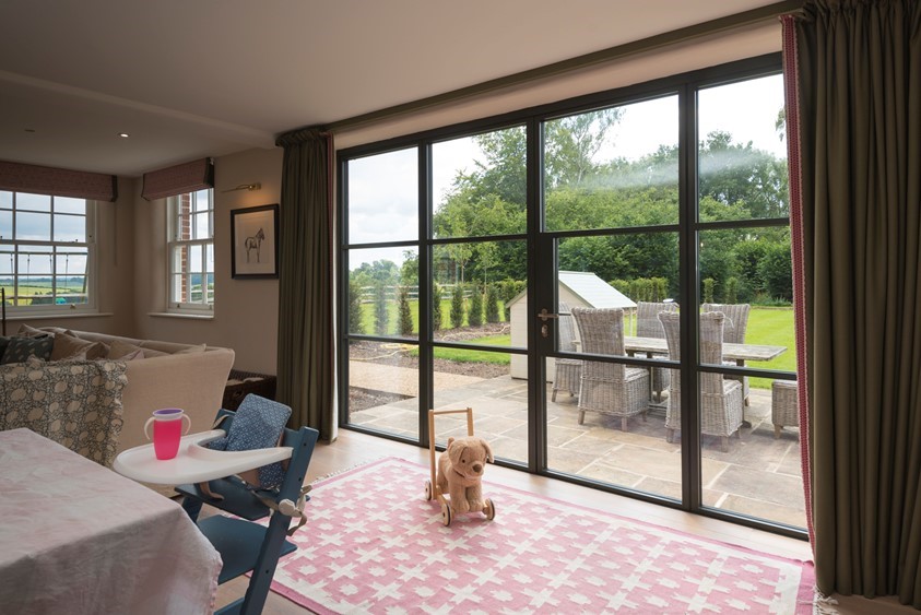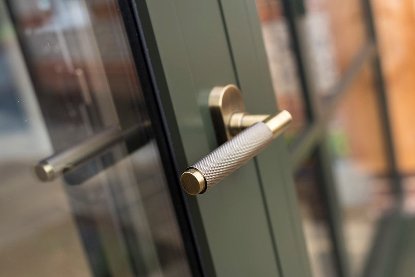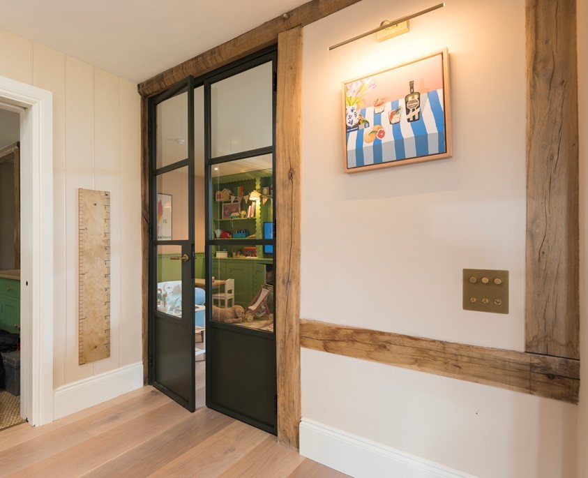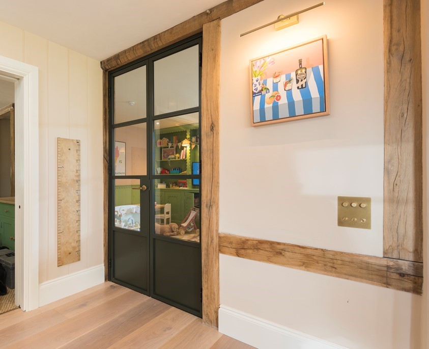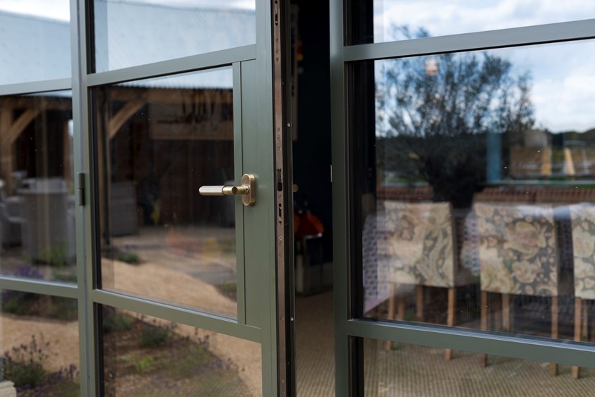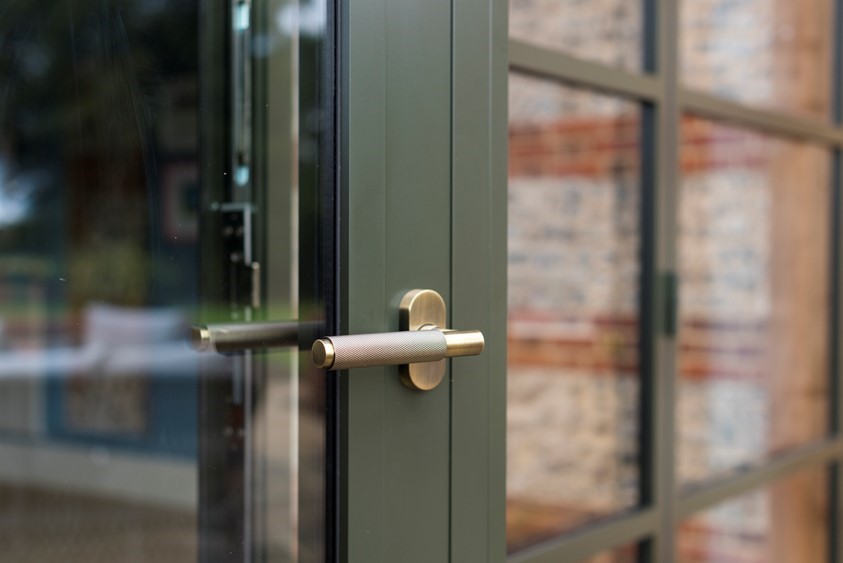 Wanting something a little different, the homeowners took advantage of Origins colour offering, with over 150 Ral colours to choose from, they eventually settled on the stunningly unique choice of Ral 6015, Black Olive. Seen featured across two sets of Origins brand new OB36+ soho external doors, OI30 soho internal doors and OW70 windows with the addition of soho bars, this property has been transformed by this collection of Origins Soho products. Complimented by our range of Antique brass and signature knurled hardware, the attention to detail on colour theory and materials have created a sense of modern sophistication that now seamlessly runs throughout their property. As a bonus, with Origins slim sightlines, the true divides do not hinder the view of the stunning countryside scenery, in-fact do they opposite, by perfectly framing picturesque squares of landscape, the doors and windows draw your eyes towards the breathtaking views surrounding the property. It’s safe to say that this couple’s boldness in going for something different has one hundred percent paid off, their home has been completely elevated by their choice of doors and windows and has allowed them to put their own stamp on this beautiful heritage country home.