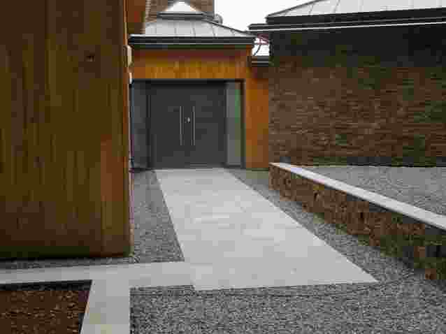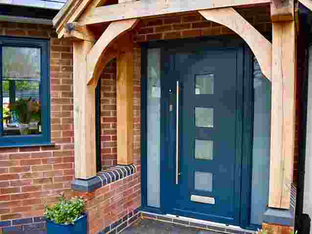A grand entrance to this spectacular home, courtesy of the Kensington SE04 Front Door Panels, with our premium OW-80 Windows as side lights and an eye-catching gable over the top really making this an incredible entry to any house.