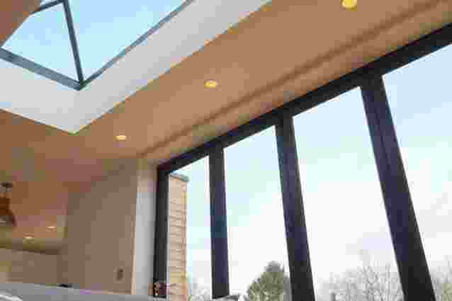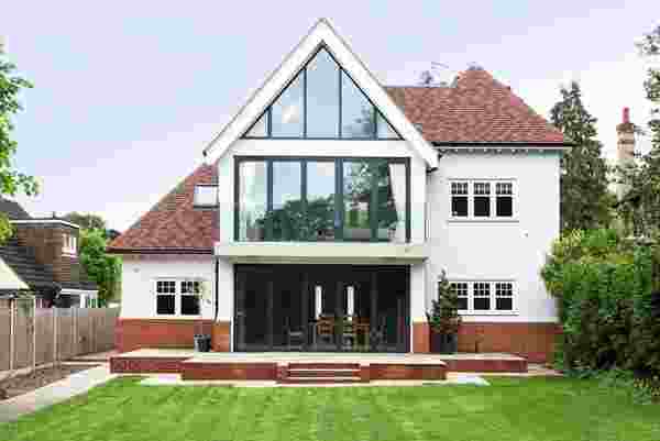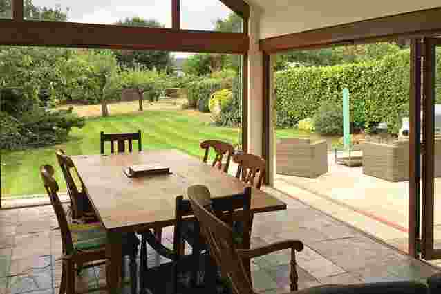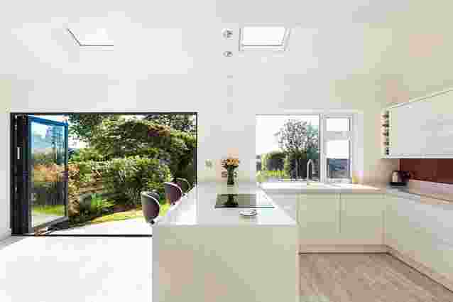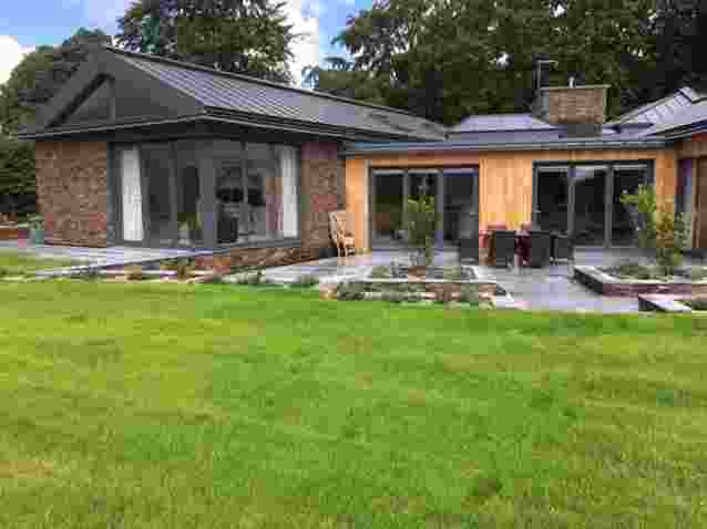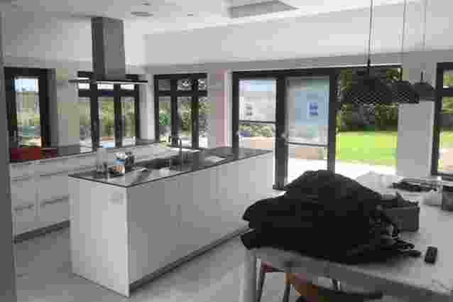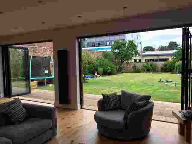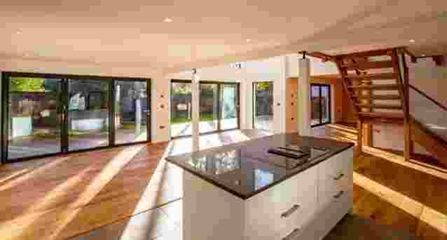An open plan family house build on the edge of a peaceful Devon village. Featuring 4 x dual coloured Origin bi-folding doors; anthracite grey externally and gloss hippca white internally, completely opening the house up to the large garden. Plus a set of French doors with full length tilt and turn windows either side which can be opened for ventilation.