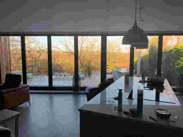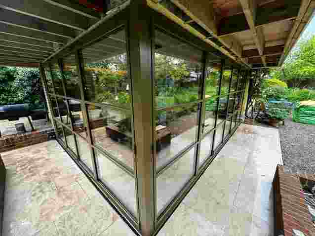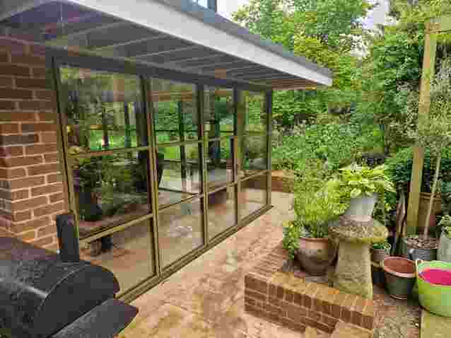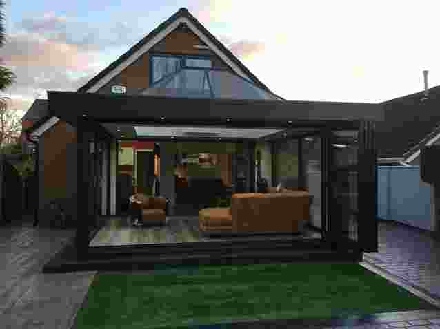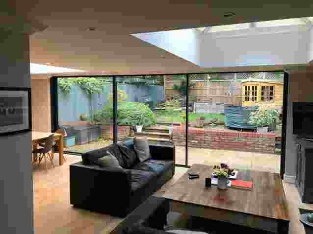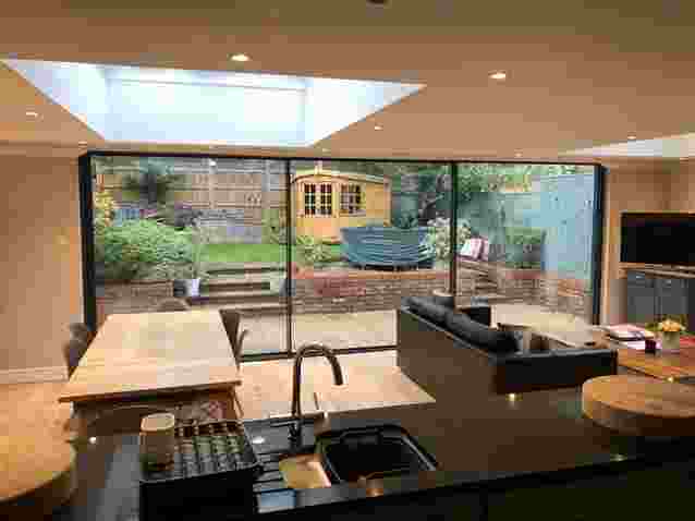 PTC created a single storey extension to this bungalow to extended the living area and to open the room up to the garden, using 2 sets of bifolds in Ral 7021 with a fixed corner post and exposed steel work on the inside, all colour matched to look as minimal as possible when the room is opened up.