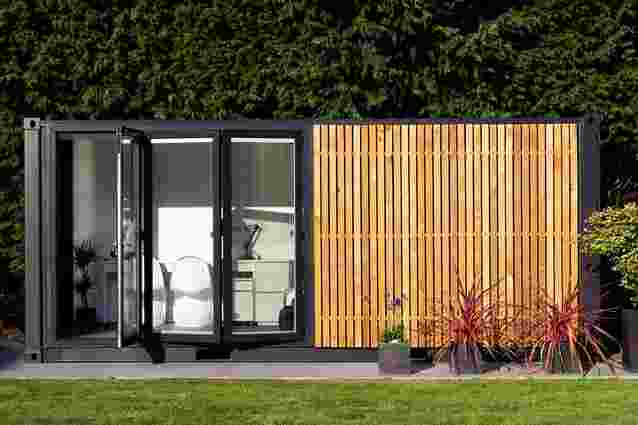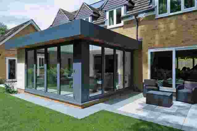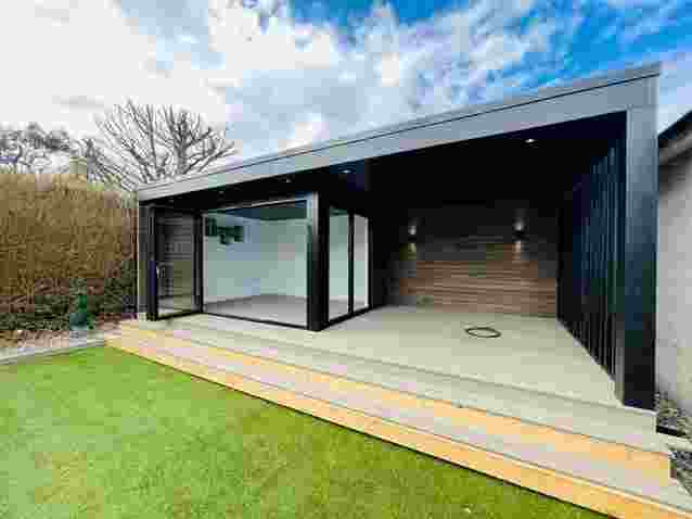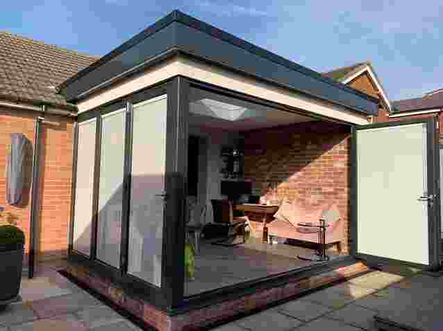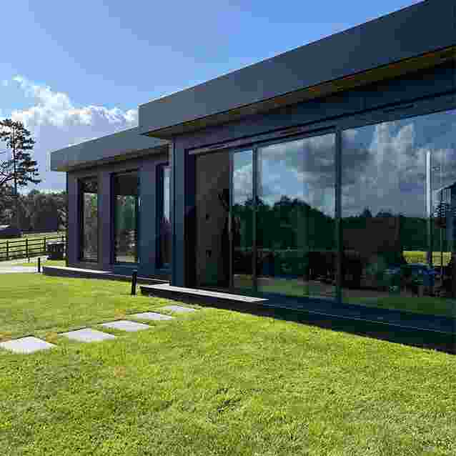 A magnificent garden pod incorporating Origin OS-77 Sliding Doors and large Fixed OW-80 Picture Windows in the timeless Anthracite Grey, RAL 7016M.