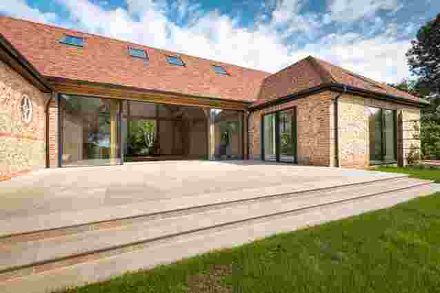 Spring Hall is a 600 square metre bespoke oak framed newly constructed dwelling, nestled in the hill side with views across the Sussex Weald. Origin products were used throughout the house, with a mix of flush casements, French and bi-folding door sets, supplied in the Black Grey profile colour with colour co-ordinated handles. In addition, triangular windows fill the gable ends of the oak barn construction, increasing the light into the communal areas.