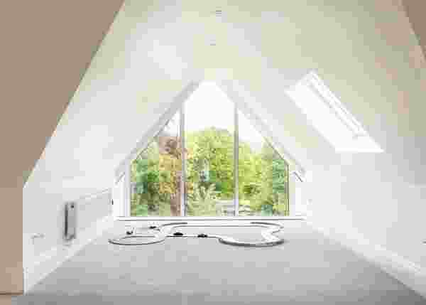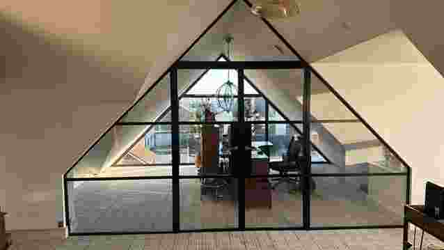 This striking loft conversion features a black-framed glass partition courtesy of our OI-30 Internal Door system, creating a sophisticated office space. The angular glazing complements the pitched roof, allowing natural light to flow while maintaining a sleek, defined structure.