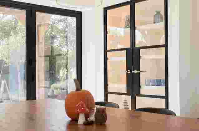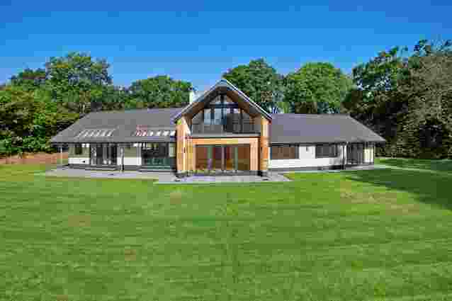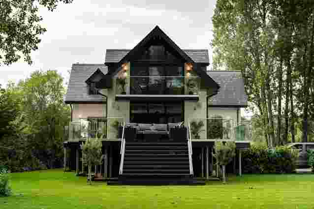 This majestic wood-cladded home epitomises current trends with the steel-look doors and windows having both vertical and horizontal divides, in the ever-popular Jet Black, RAL 9005M.