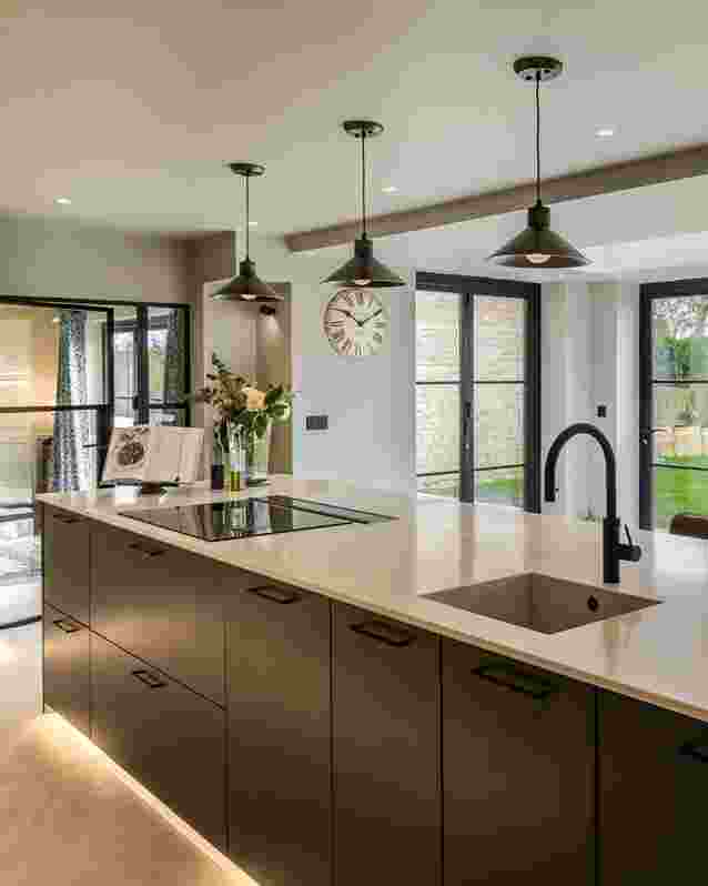 Inside, the open-plan layout flows effortlessly from the kitchen to the garden, anchored by deep, earthy tones and natural textures. Generous glazing introduces light from every angle, framing views out to the garden while maintaining a strong sense of architectural symmetry.