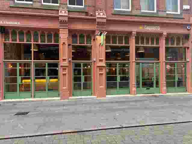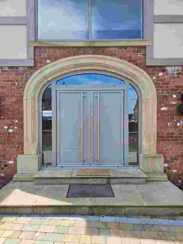 A beautifully restored façade blending heritage charm with modern appeal. The soft terracotta exterior, intricate detailing, and Pale Green, RAL 6021M, OB-36+ Soho External Doors create a timeless look.