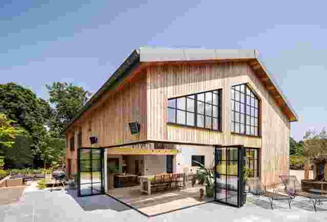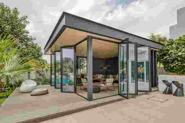 This unique garden building is made up of walls of bespoke bi-folding doors, filling it with natural light.