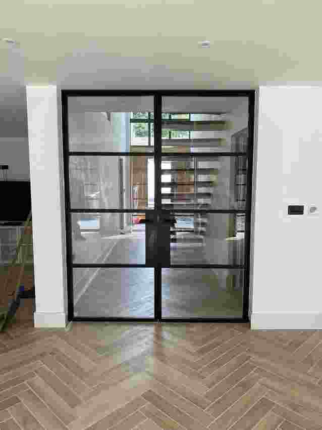 A luxurious hallway is immaculately complemented by the Origin OI-30 Internal Door in the ever-popular 9005M Jet Black RAL. Previously a set of wooden doors, the upgrade to Black Aluminium has really added a further touch of opulence.
