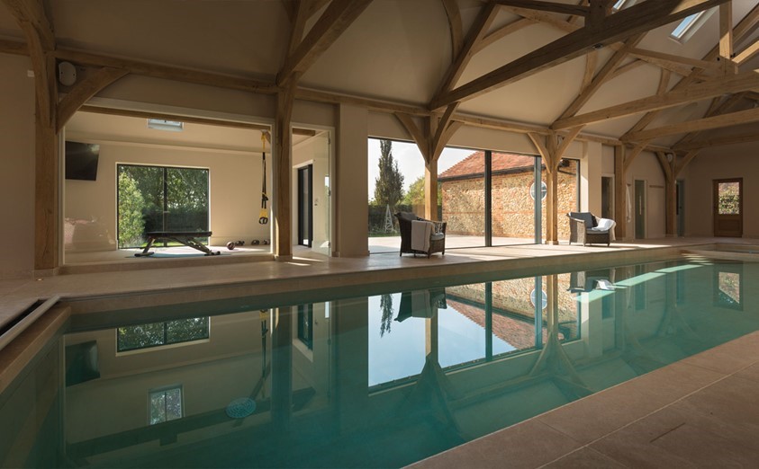 The Johnson’s built their new pool room in the summer of 2018 and knew that they wanted large expanses of glass incorporated into the building to give the indoor pool an ‘outdoor’ feel all year round. To achieve this, it was important to encourage as much natural light as possible into the space, so that the room would become a calm place to exercise and relax in.