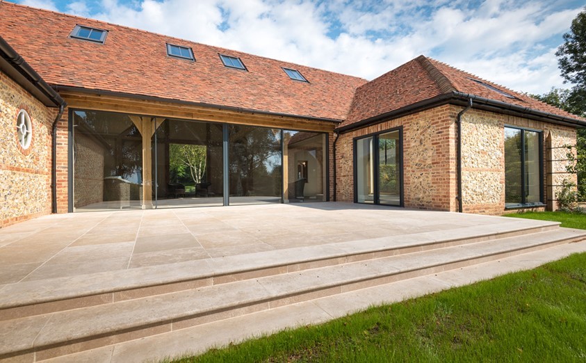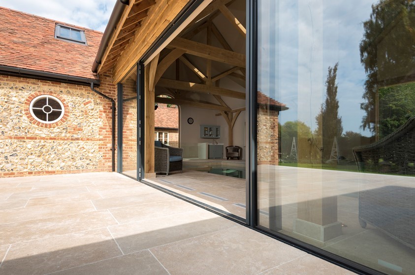 With its traditional style stone walls, the couple felt that the pool house needed a door colour that would contrast yet compliment the rest of the newly finished building. With over 150 RAL colours to choose from, the couple were spoilt for choice. Anthracite Grey (7016M) was chosen, which the Johnson’s felt would give the building a modern meets traditional look. The same colour was chosen for the inside of the doors, which is perfectly softened and contrasted by the natural oak beams that support the building.